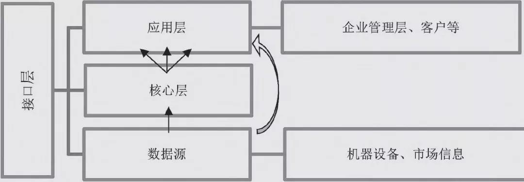 从以上对三种架构的描述中可以发现,现有的架构划分主要将工业互联网平台视为一种技术,而很少从整个产业的视角进行解析。进一步看,随着工业互联网在功能、类型和表现形式上的不断演进,以上三种架构都很难用于描述整个产业内所有具有平台特征的主体。目前我国正处于制造业转型升级的关键时期,制造业的各个领域都对工业互联网提出了更高的要求,要全方位、最大化地发挥工业互联网的作用,就需要一种统一的平台系统架构对其进行解析。本文在归纳了平台共性的系统架构特征的基础上,结合制造业对工业互联网平台功能的需求,将工业互联网平台的架构分为核心层、应用层和接口层(见图1)。其中,核心层为平台架构中长期不变的模块,具有基础性和通用性,如系列产品的核心功能、数据处理分析技术、核心建模和算法、数据集成管理等;应用层为平台架构中具有多样性特征的外围模块,如细分市场的衍生产品、工业软件系统中的微服务模块、平台的个性化拓展服务、企业定制工业APP等,以适应多样、变化的需求场景;接口层为数据源与核心层、数据源与应用层、核心层与应用层以及各层架构内部主体之间的接口,如网关、通讯协议、行业标准、数据转换等。