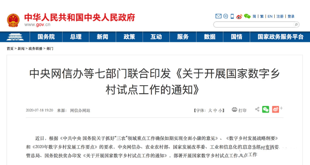 中央网信办等七部门联合印发《关于开展国家数字乡村试点工作的通知》